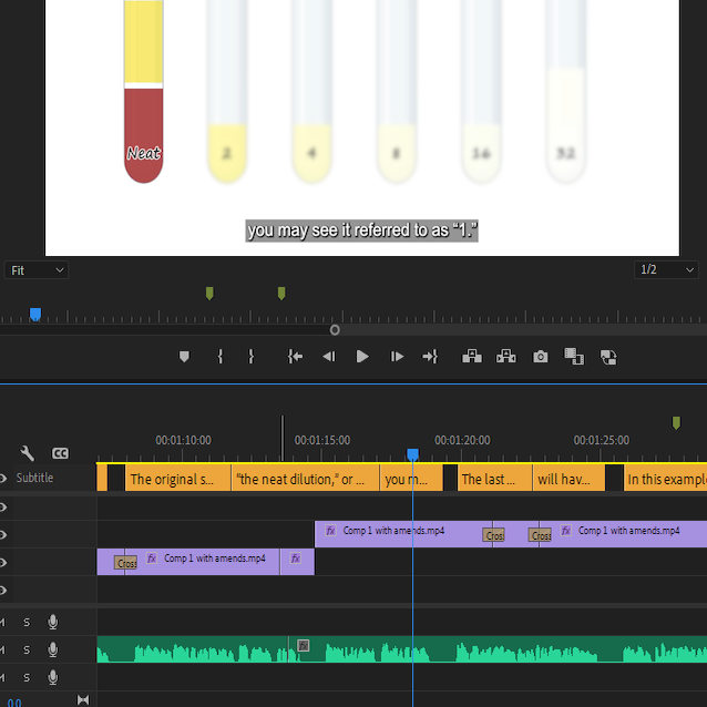Using a combination of Adobe Photoshop (for static PNG and SVG resources), After Effects (to add movement to these statis resources) and Premiere Pro (to compose, align narration and create subtitles), I develop an animation of the doubling dilution process. I called on a number of animation principles for this activity, particularly cueing and anti-cueing, to ensure that learners’ visual attention was subtly guided during learning to most effectively enhance comprehension.